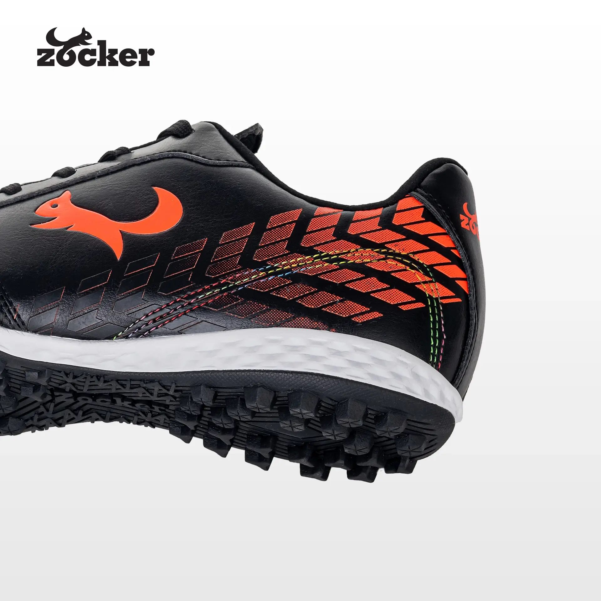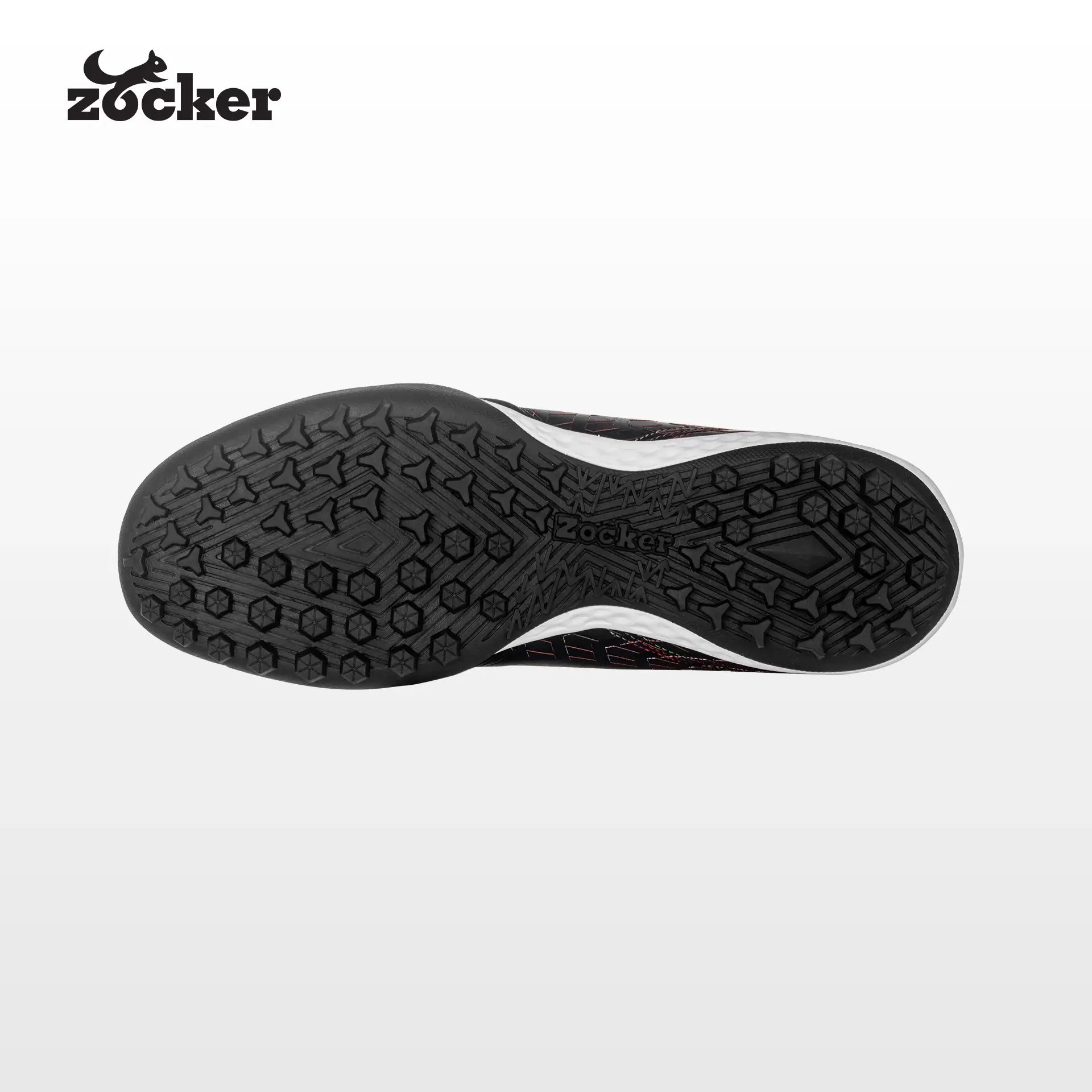 Positioned as a premium Vietnam-based branded (OBM) turf model, this football shoe uses genuine kangaroo leather (K-Leather) on the upper for an ultra-soft, close-to-ball feel with a secure, glove-like fit and long-wear durability, supported by an upgraded elastic insole for improved comfort and a softer heel lining to reduce heel slip and enhance ankle support; the specialized turf outsole applies Zocker’s dual-friction concept for reliable grip and quick acceleration on artificial pitches, with TF studs made from 100% rubber to minimize wear—even in damp conditions—finished in a clean Black colorway and offered in sizes 38–44 (incl. 42.5) with a 4-month 1-for-1 manufacturer warranty.