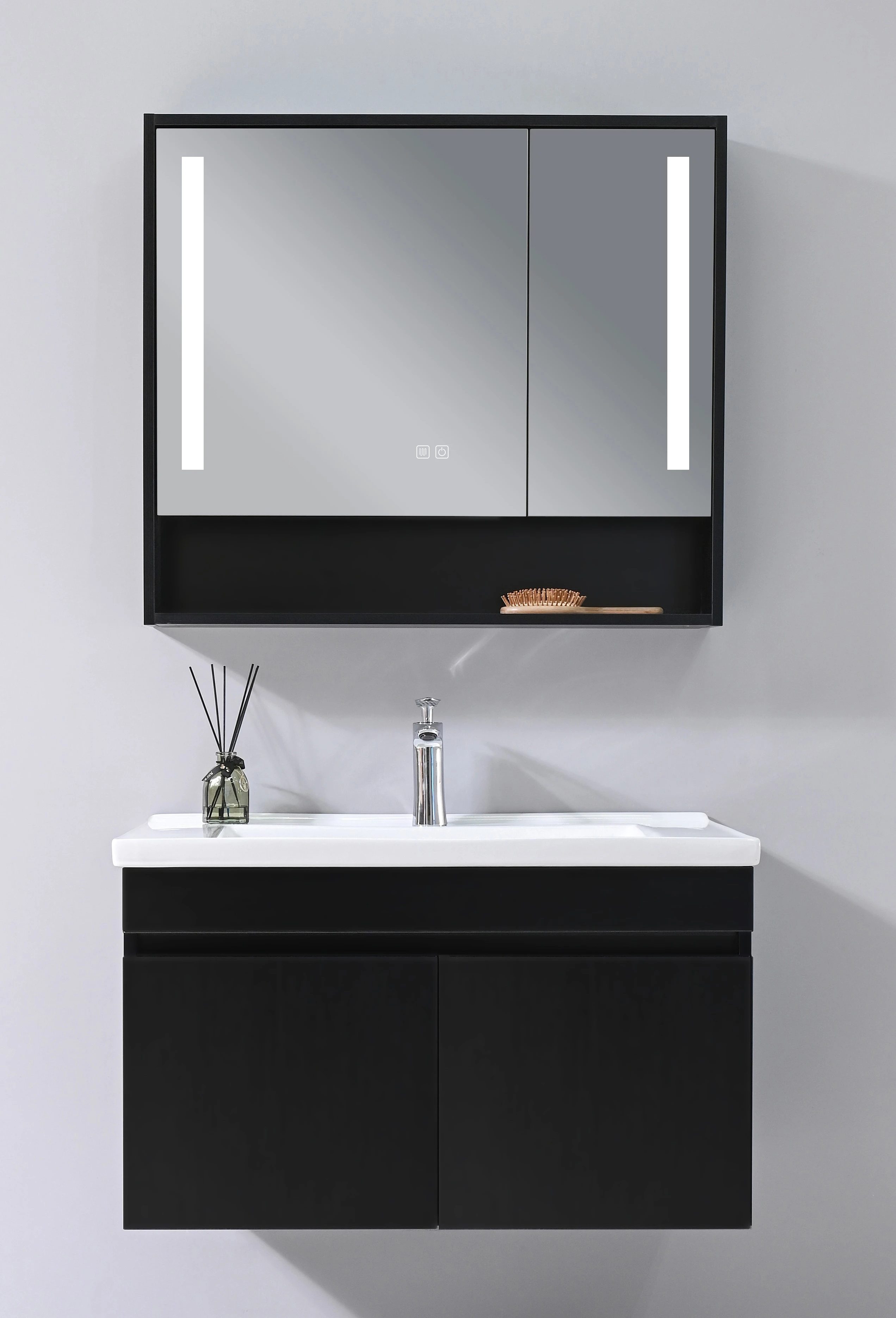 The SELTA SP-8249-800 Bathroom Vanity Set is a modern, space-efficient solution designed for international sourcing, featuring a high-grade PVC cabinet engineered for water resistance, dimensional stability, and long-term durability, paired with a ceramic lavabo finished with nano-glaze for anti-stain, scratch resistance, and easy maintenance; the set includes a smart 4mm mirror with dual-mode LED lighting and integrated storage behind the mirror, soft-close hinges, smooth sliding hardware, and a functional compartment layout, making it ideal for residential, hospitality, and project-based bathroom applications seeking reliable materials and contemporary design.