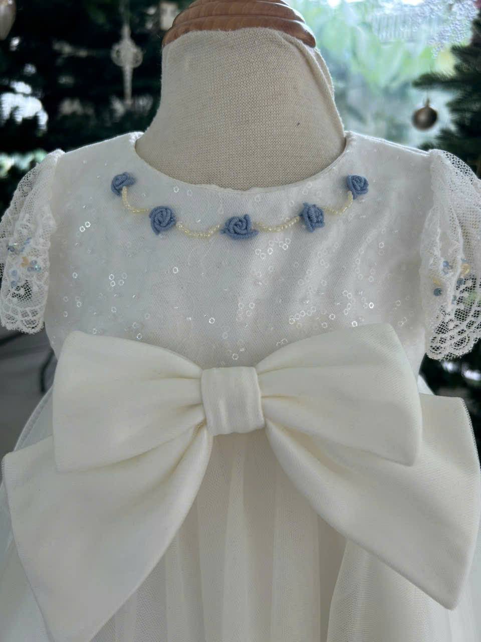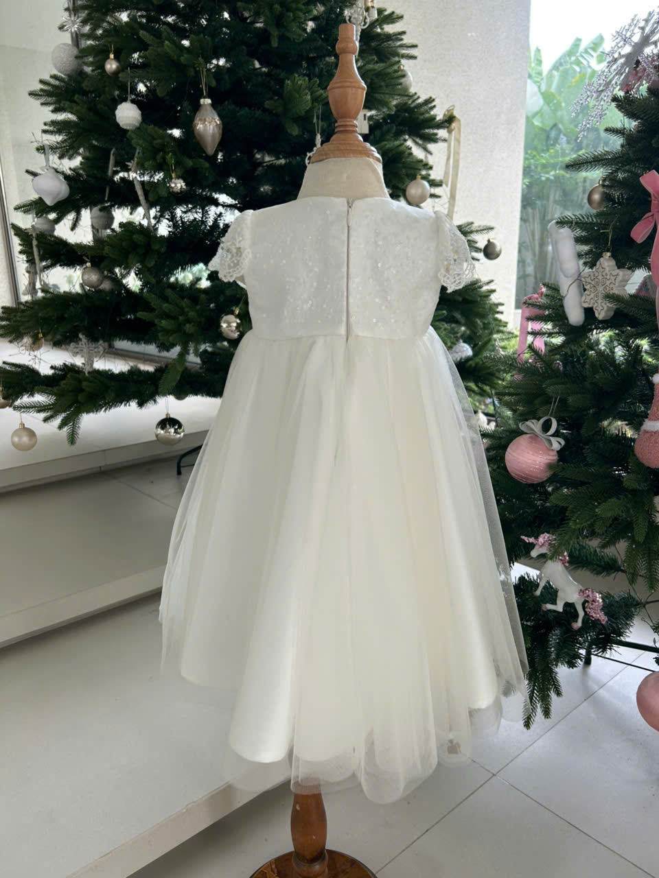 An ODM/OEM-capable kids’ special-occasion party dress manufactured in Ho Chi Minh City, Vietnam, crafted with a multi-layer construction featuring tulle and sequin tulle outer layers, taffeta structure, and a satin lining, finished with crystal and sequin hand-beading plus floral hand embroidery for a premium boutique look; available in sizes from 6M–9Y (or customized), with customizable white/color options and logo placement for private label programs, MOQ 50 pcs, and export-ready packing of 1 pc per zipper bag plus 1 pc per 18×40×22 cm box (or per buyer request).
