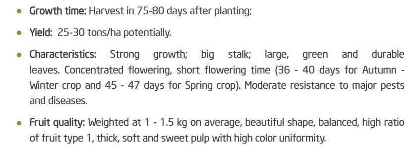 Super Goldstar 999 F1 Hybrid Pumpkin Seed is a high-yield pumpkin variety developed and cultivated in Vietnam, suitable for commercial production and fresh markets. The crop reaches harvest in 75–80 days after planting, with yield potential of 25–30 tons/ha. The variety features strong growth, vigorous vines, large and durable green leaves, and concentrated flowering, ensuring uniform fruit set. Fruits weigh an average of 1–1.5 kg, with attractive shape, high proportion of grade-1 fruits, thick flesh, soft texture, sweet taste, and uniform color. With moderate resistance to major pests and diseases, Super Goldstar 999 is well-suited for intensive farming and export-oriented sourcing.