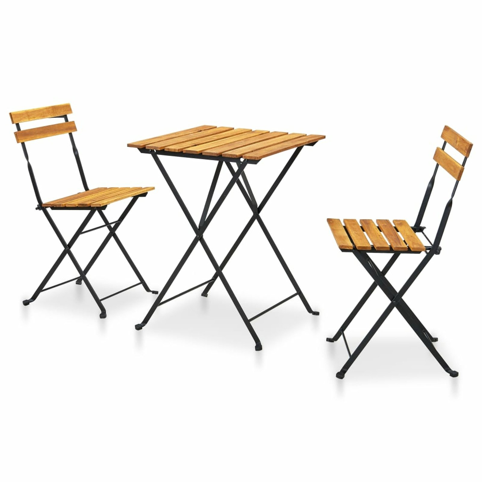 A compact 3-piece bistro set (1 table + 2 chairs) combining acacia wood with a steel structure, designed for balconies, patios, cafés, and export-ready flat/foldable handling. Manufactured in Vietnam (Dong Nai) and commonly packed as 1 set per carton for international wholesale distribution.