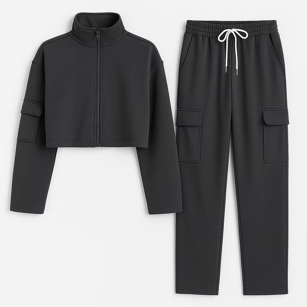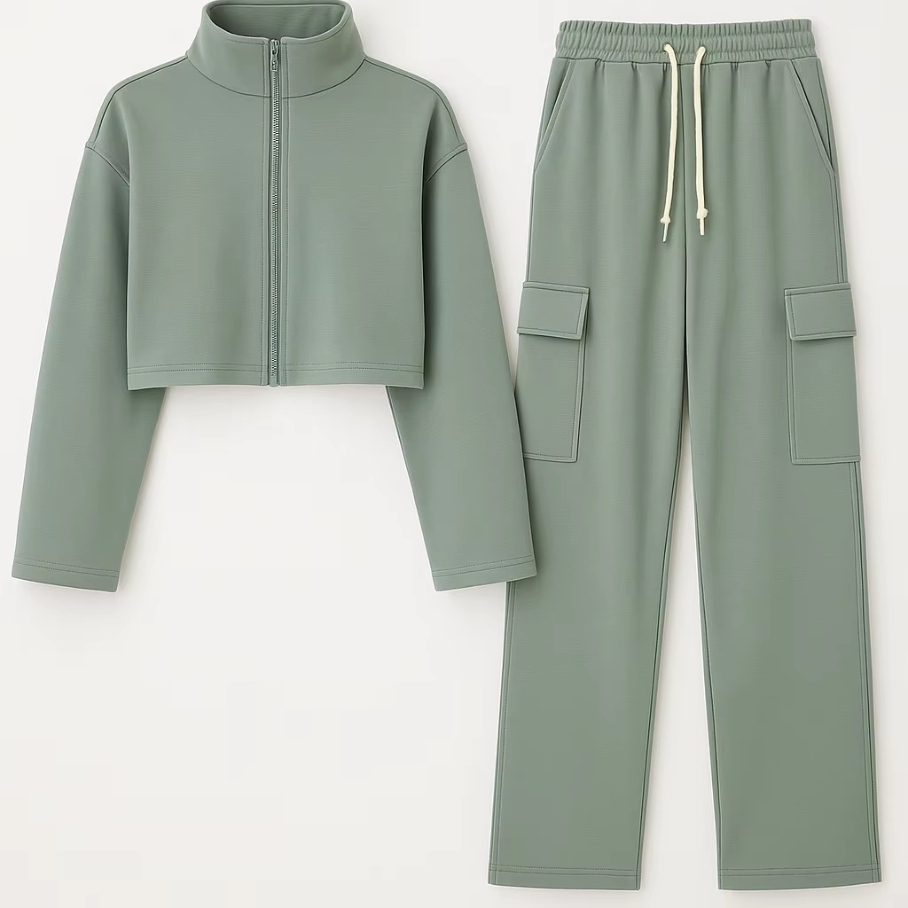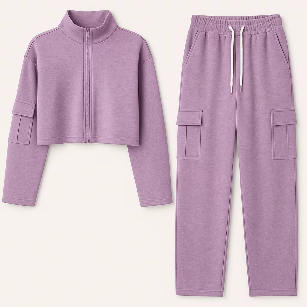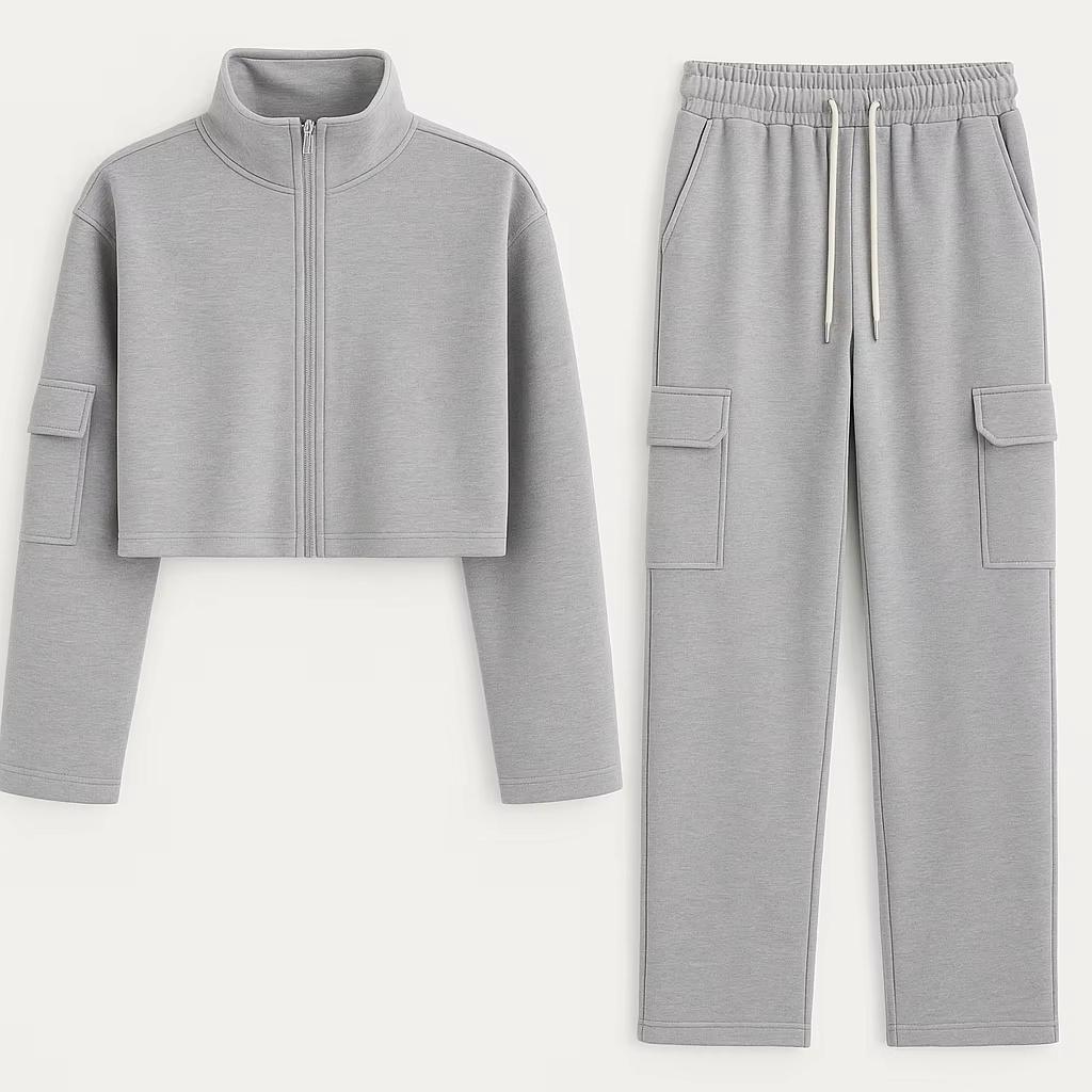 This women’s activewear set features a stand-collar, long-sleeve zip crop hoodie designed for gym and lifestyle use, made from 300gsm French terry (50% cotton / 50% polyester) with a soft-touch feel and anti-wrinkle performance. Manufactured in Vietnam, it supports OEM/ODM custom service for brands and buyers, including custom fabrics (as requested), sizes, colors, and logo placement—ideal for bulk sourcing of sporty-casual collections.